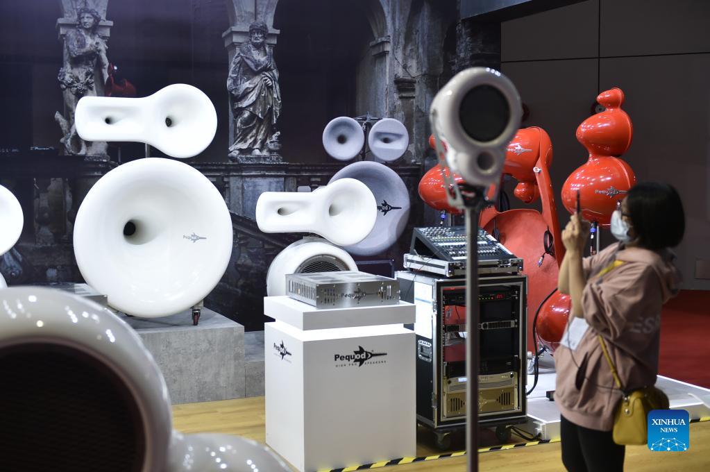A visitor takes photos at the booth of Pequod Acoustics during the 4th China International Import Expo (CIIE) in east China's Shanghai, Nov. 6, 2021. Pequod Acoustics takes part in the CIIE for the first time. The 4th CIIE kicked off on Nov. 5 and will last till Nov. 10, attracting over 3,000 businesses from 127 countries and regions. (Xinhua/Lu Peng)