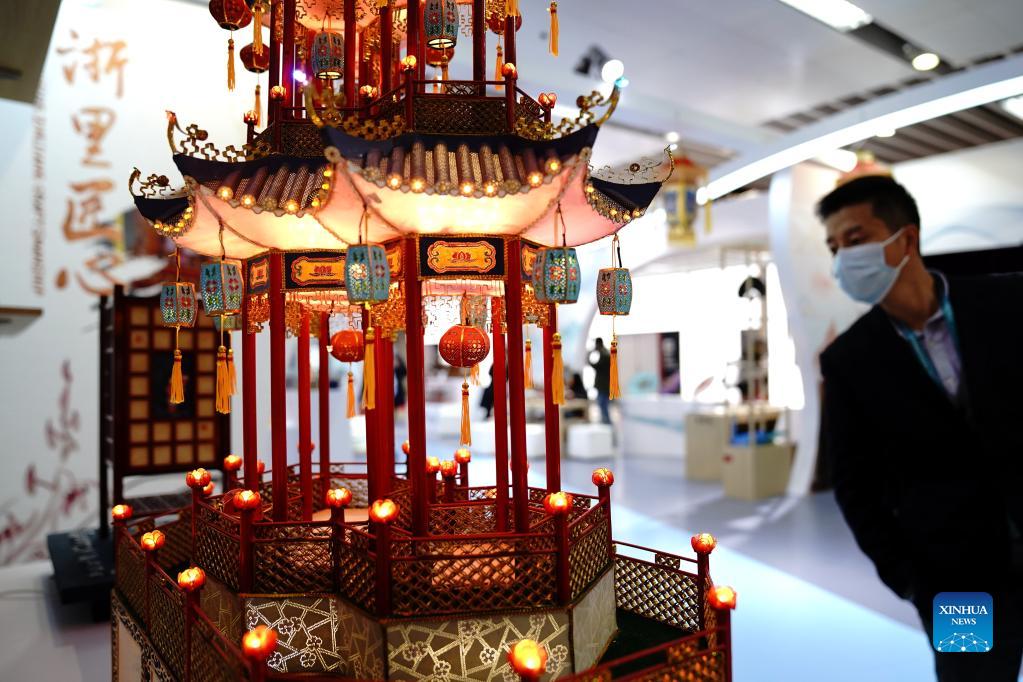 A man looks at a traditional festive lantern from east China's Zhejiang Province while visiting the China International Import Expo (CIIE) at the National Exhibition and Convention Center (Shanghai) in Shanghai, east China, Nov. 8, 2021. The ongoing 4th China International Import Expo (CIIE) is held in Shanghai from Nov. 5 to Nov. 10. (Xinhua/Zhang Jiansong)
