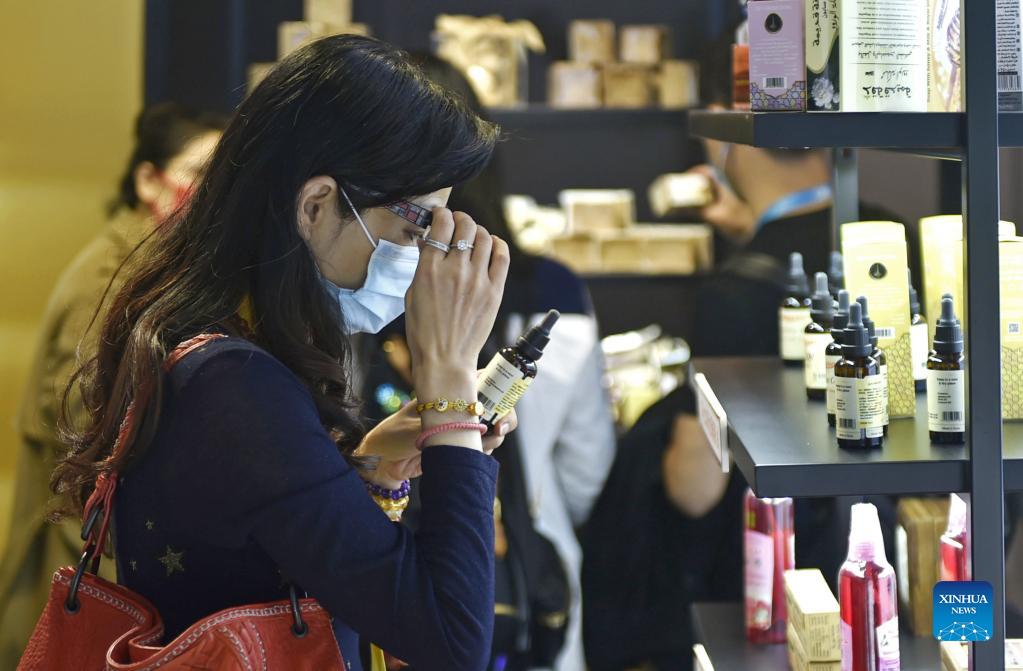 A visitor checks a Syrian essential oil product during the 4th China International Import Expo (CIIE) in east China's Shanghai, Nov. 6, 2021. (Xinhua/Lu Peng)