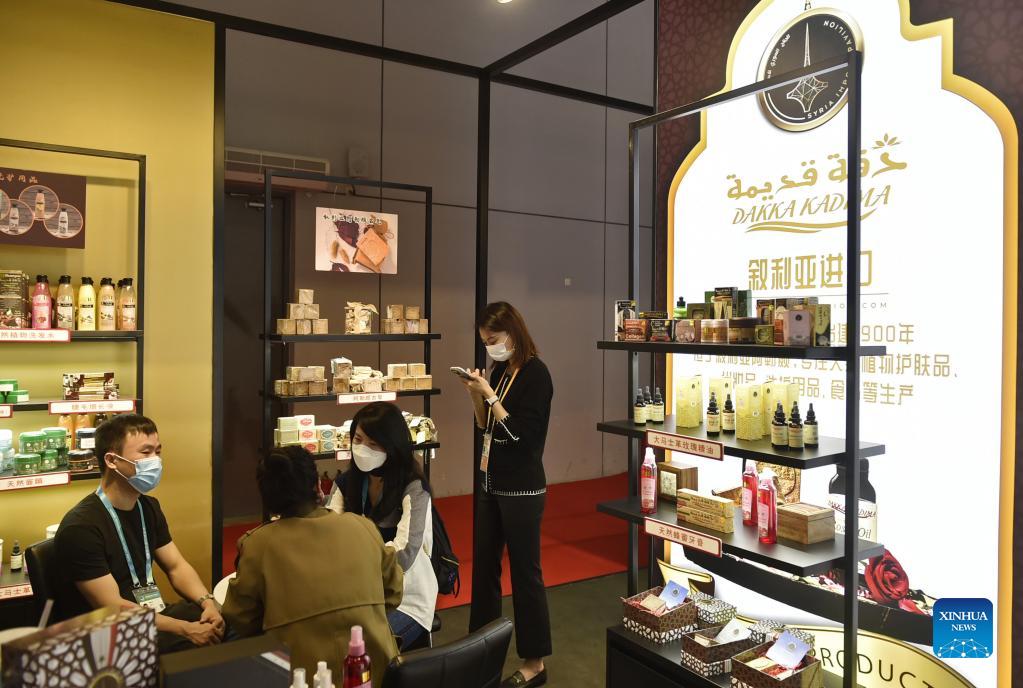 Photo taken on Nov. 6, 2021 shows a Syrian exhibitor's booth at the 4th China International Import Expo (CIIE) in east China's Shanghai. (Xinhua/Lu Peng)