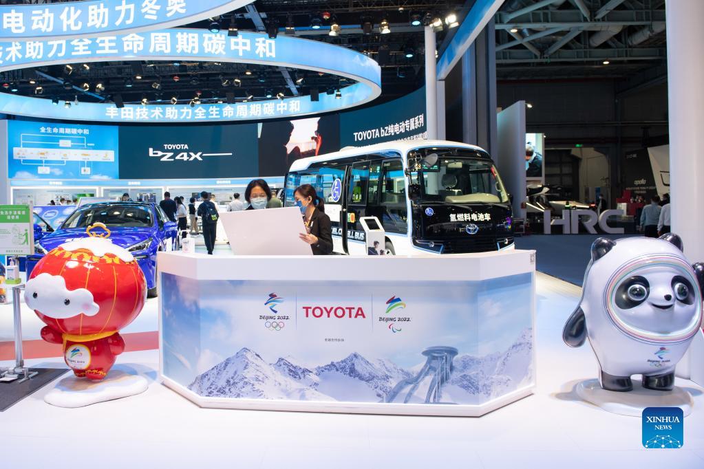Photo taken on Nov. 7, 2021 shows the mascot of Beijing 2022 Olympic Winter Games Bing Dwen Dwen (R) and the mascot of Beijing 2022 Paralympic Winter Games Shuey Rhon Rhon at the booth of Toyota during the fourth China International Import Expo (CIIE) in east China's Shanghai. (Xinhua/Meng Tao)