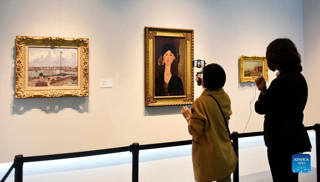 Reporters record video clips of artworks exhibited at the Trade in Services Exhibition Area of the 4th China International Import Expo (CIIE) in east China's Shanghai, Nov. 7, 2021. The 4th China International Import Expo (CIIE) has drawn over 300 businesses from over 50 countries and regions at its Trade in Services Exhibition Area. (Xinhua/Xu Liang)