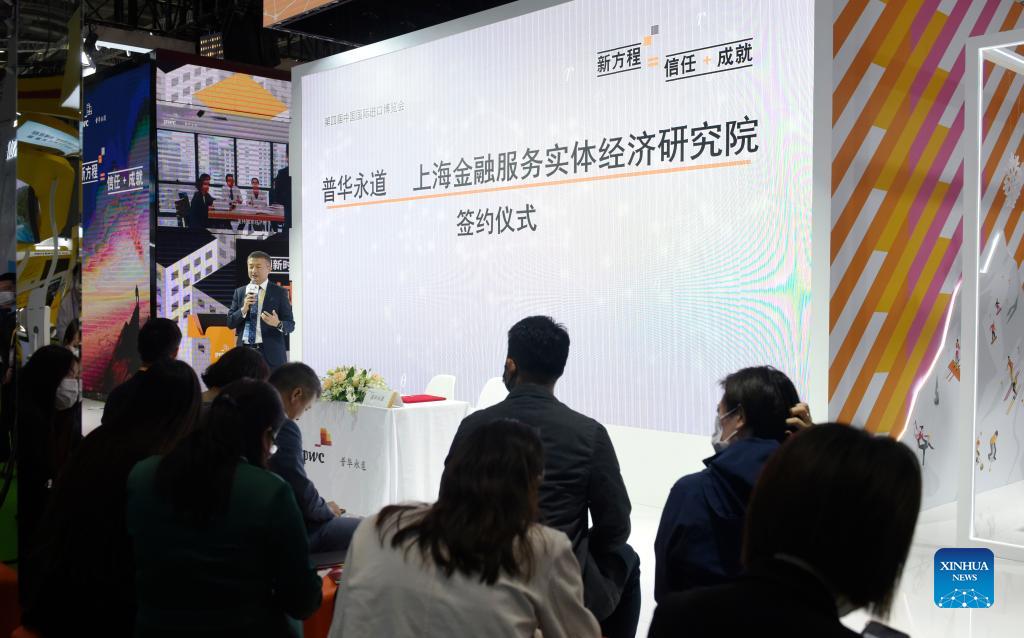People take part in a signing ceremony at the PwC booth at the Trade in Services Exhibition Area of the 4th China International Import Expo (CIIE) in east China's Shanghai, Nov. 7, 2021. The 4th China International Import Expo (CIIE) has drawn over 300 businesses from over 50 countries and regions at its Trade in Services Exhibition Area. (Xinhua/Xu Liang)