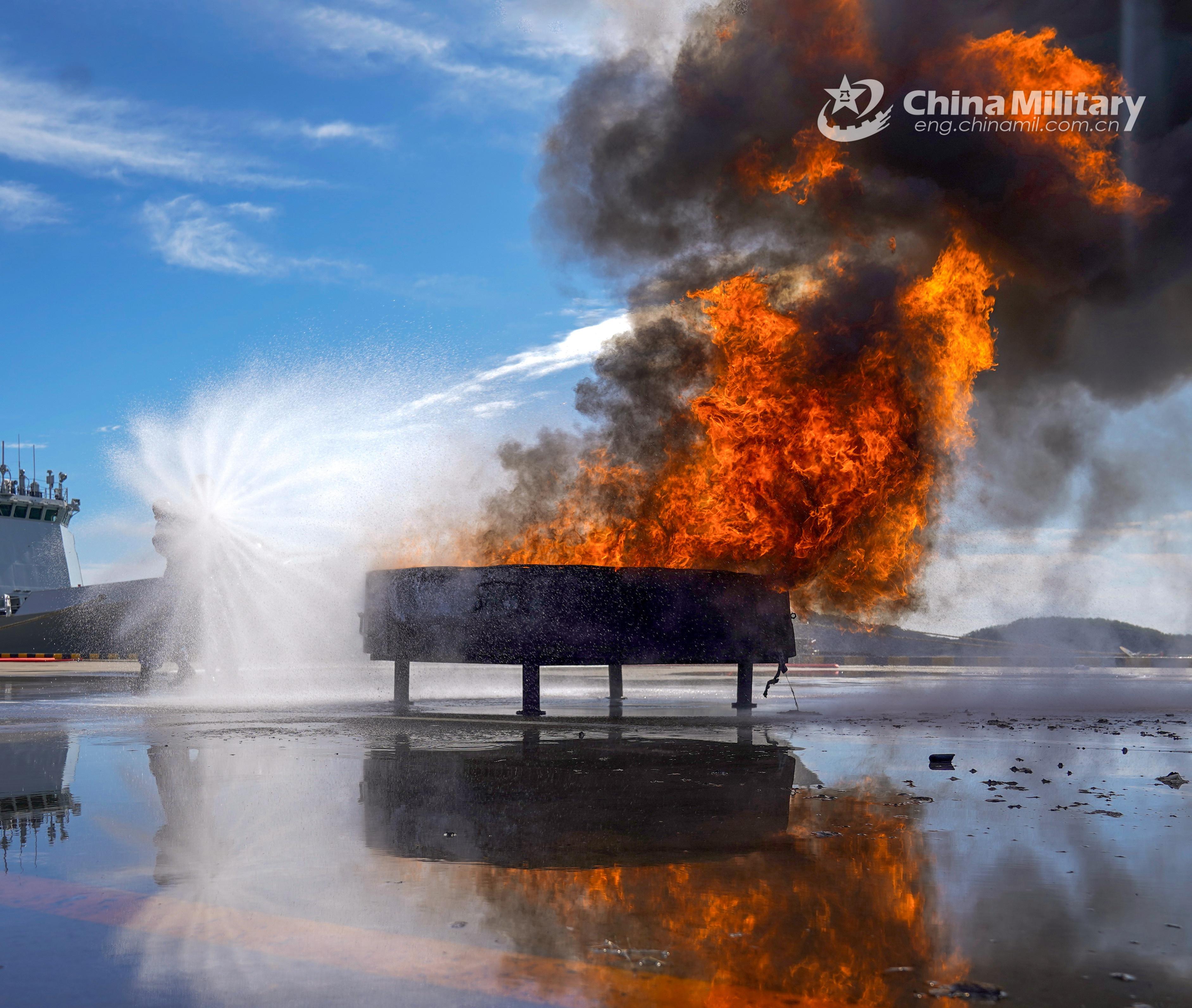 Sailors assigned to a destroyer flotilla with the navy under the PLA Northern Theater Command man a hose for high-pressure extinction during a recent damage control drill at a military port on October 11, 2021. (eng.chinamil.com.cn/Photo by Zhang Yan)