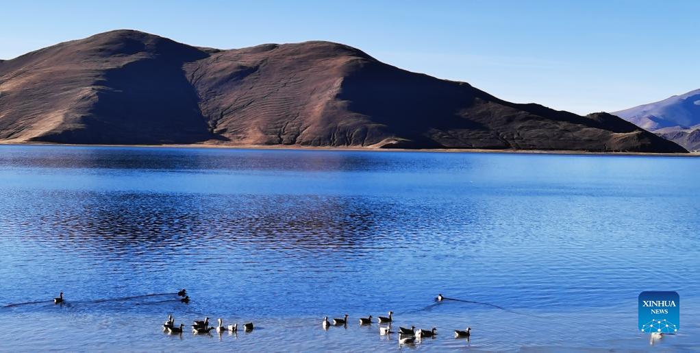 This picture shows the charming view of Yamdrok Lake as winter creeps in. The Yamdrok Lake, which nestles in Nagarze County of Shannan City, southwest China's Tibet Autonomous Region, is one of the three holy lakes in the region. Yamdrok means "jade" in Tibetan, which vividly depicts the limpidity and the fine blue color of the water. (Xinhua/Shen Hongbing)