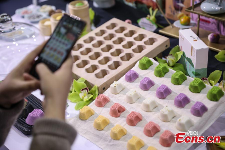 Zhiweiguan, a restaurant which was founded in 1913, exhibits its local specialty in Zhejiang Pavilion of the 4th CIIE, National Exhibition and Convention Center (Shanghai), Shanghai Municipality, Nov. 8, 2021. (Photo: China News Service/Zhang Hengwei)