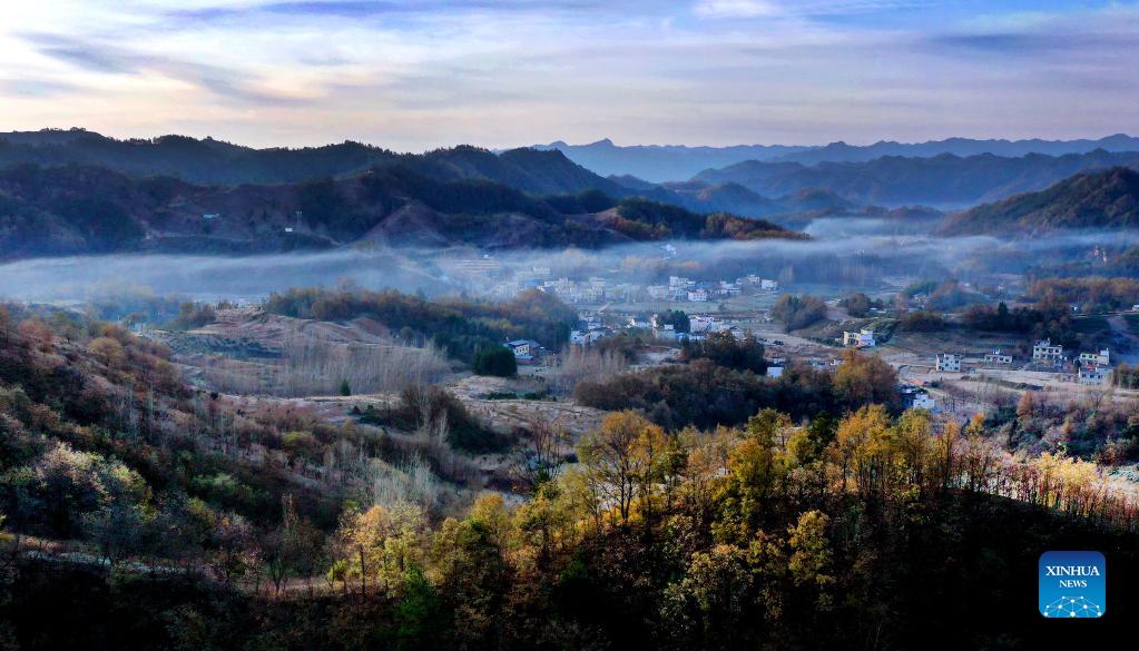 Aerial photo taken on Nov. 9, 2021 shows a view of Shangnan County, a remote town tucked in the Qinling Mountains, in northwest China's Shaanxi Province. (Xinhua/Tao Ming)