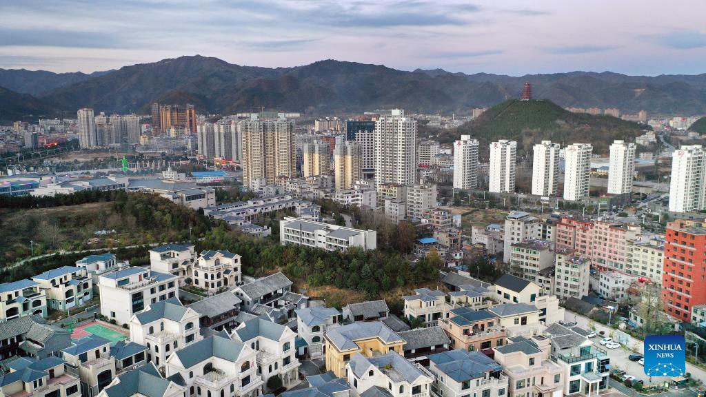Aerial photo taken on Nov. 8, 2021 shows a view of Shangnan County, a remote town tucked in the Qinling Mountains, in northwest China's Shaanxi Province. (Xinhua/Tao Ming)