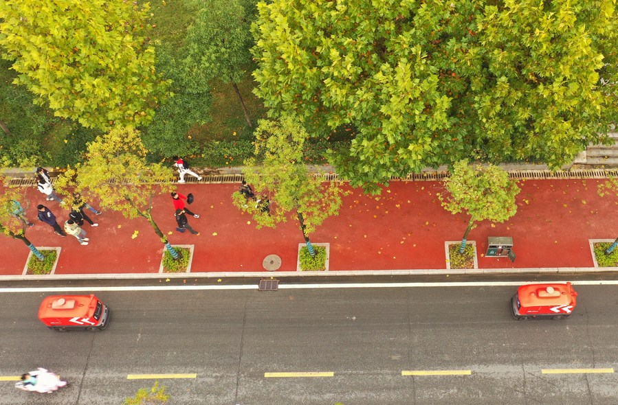 Aerial photo taken on Nov. 2, 2021 shows unmanned express delivery vehicles running on campus of the University of South China in Hengyang, central China's Hunan Province. (Photo by Cao Zhengping/Xinhua)