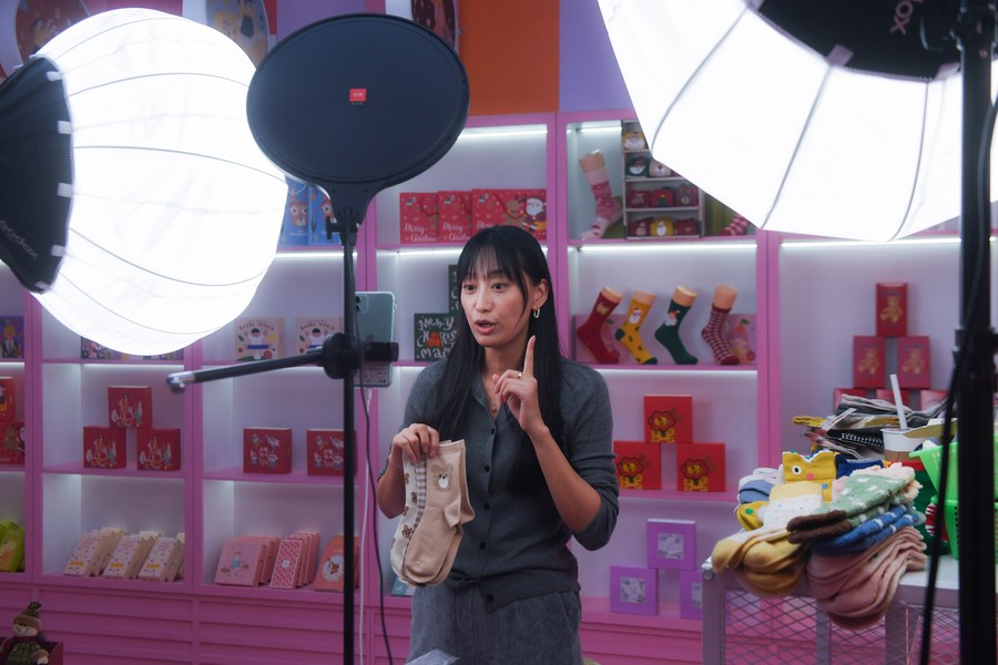 A saleswoman promotes socks via live streaming in Zhuji, east China's Zhejiang Province, Nov. 2, 2021. (Xinhua/Xu Yu)