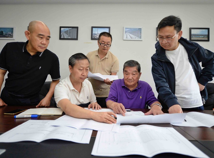 Wang Qichang (2nd R) discusses a program with team members in Chengdu, southwest China's Sichuan Province, Sept. 15, 2021.(Xinhua/Liu Kun)