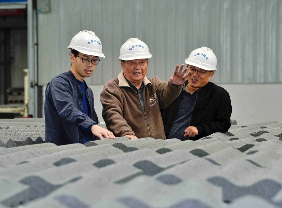 Wang Qichang (C) talks with technicians at a sound barrier material factory in Chengdu, southwest China's Sichuan Province, Nov. 4, 2021.(Xinhua/Liu Kun)