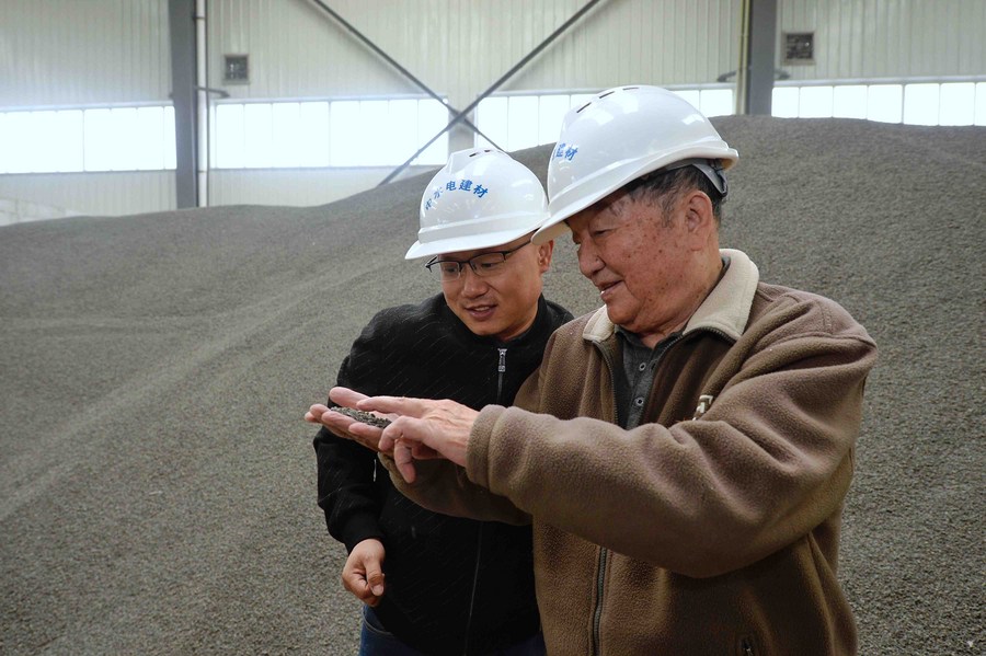 Wang Qichang (R) talks with a technician at a sound barrier material factory in Chengdu, southwest China's Sichuan Province, Nov. 4, 2021.(Xinhua/Liu Kun)