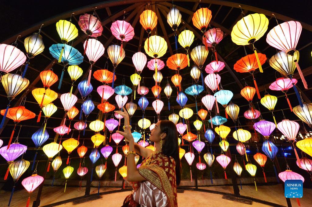 People visit a pre-show of the Thailand International Lantern and Food Festival at Muangboran, Samut Prakan Province, Thailand, on Nov. 8, 2021. The festival will be held from Nov. 12 to Dec. 6. (Xinhua/Rachen Sageamsak)