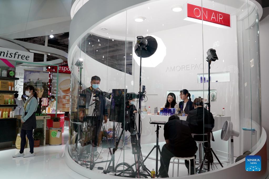 Staff members promote commodities in a livestreaming studio at the Consumer Goods Exhibition Area of the 4th China International Import Expo (CIIE) in east China's Shanghai, Nov. 9, 2021. Lots of exhibitors at the 4th CIIE resort to livestreaming promotion at their booths to attract on-line buyers for items displayed on-site. (Xinhua/Liu Ying)