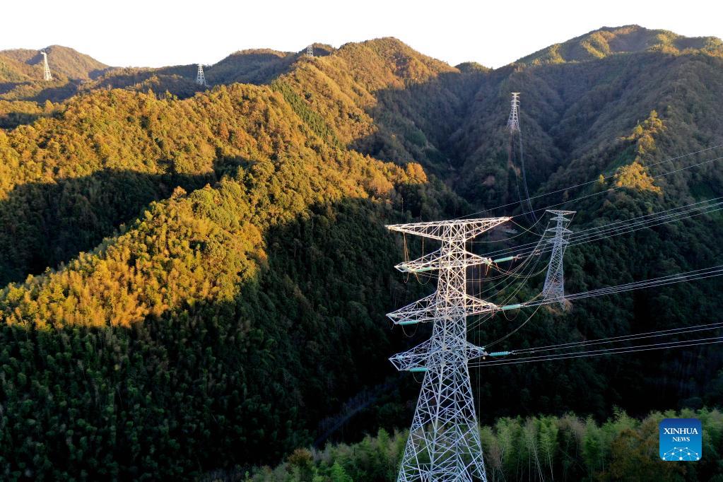 Aerial photo taken on Nov. 8, 2021 shows power transmission towers in Qimen County of Huangshan City, east China's Anhui Province. A 110KV power transmission and transformation project is under construction in deep mountains in Qimen County. The total length of this project is about 30 kilometers. It is expected to be put into operation by the end of November this year. (Photo by Zhao Xianfu/Xinhua)