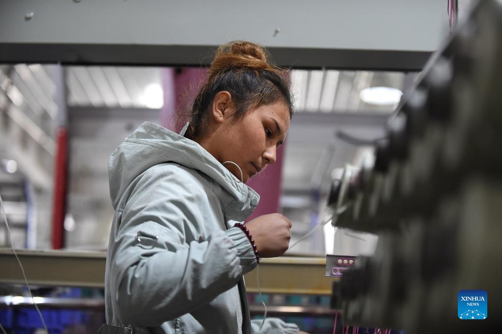 A worker works at a packaging material industrial park at Yopurga County in Kashgar, northwest China's Xinjiang Uygur Autonomous Region, Nov. 8, 2021. The industrial park, mainly engaged in the production and sales of packaging materials such as woven bags, has attracted a total of 19 enterprises, providing 1,500 jobs for local residents. (Xinhua/Hou Zhaokang)