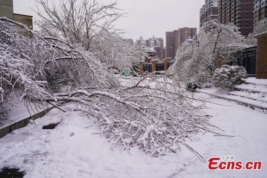 Snow and icicles overwhelm a tree by the roadside in Harbin, Heilongjiang Province, Nov. 9, 2021. (Photo/Sun Hanlun)