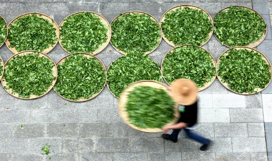 A tea maker airs newly-picked tea leaves in Wuyishan City, southeast China's Fujian Province, April 10, 2021. (Photo by Chen Ying/Xinhua)
