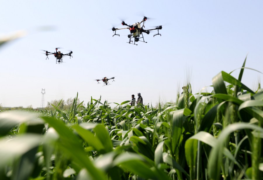 Staff members operate drones in the fields in Cao'an Village of Quanjiao County, east China's Anhui Province, April 9, 2021. (Photo By Shen Guo/Xinhua)