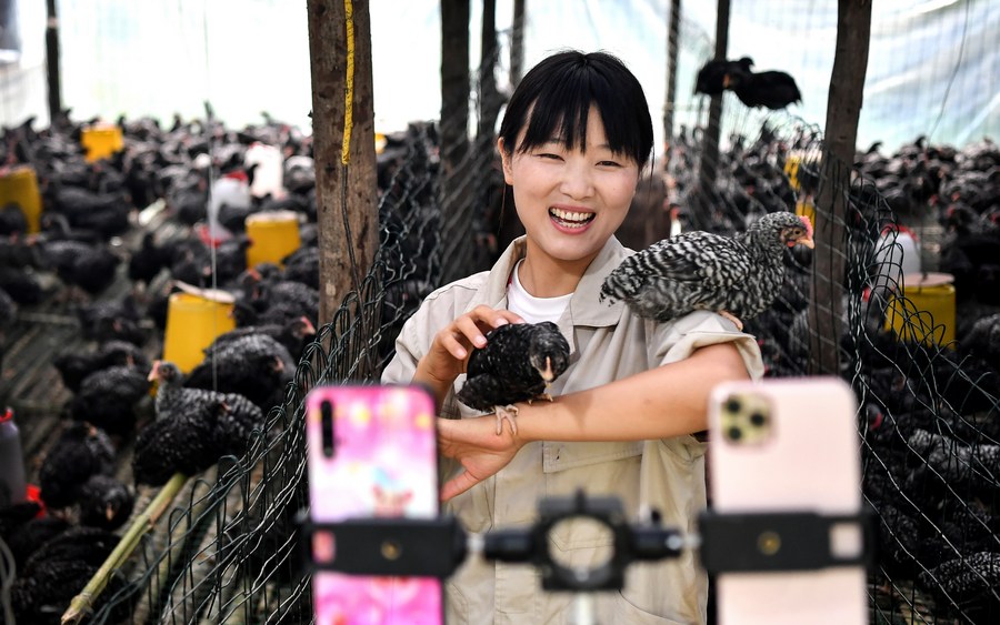 A woman promotes chickens via a live show in Siping Village of Danfeng County, northwest China's Shaanxi Province, July 20, 2020. (Xinhua/Liu Xiao)