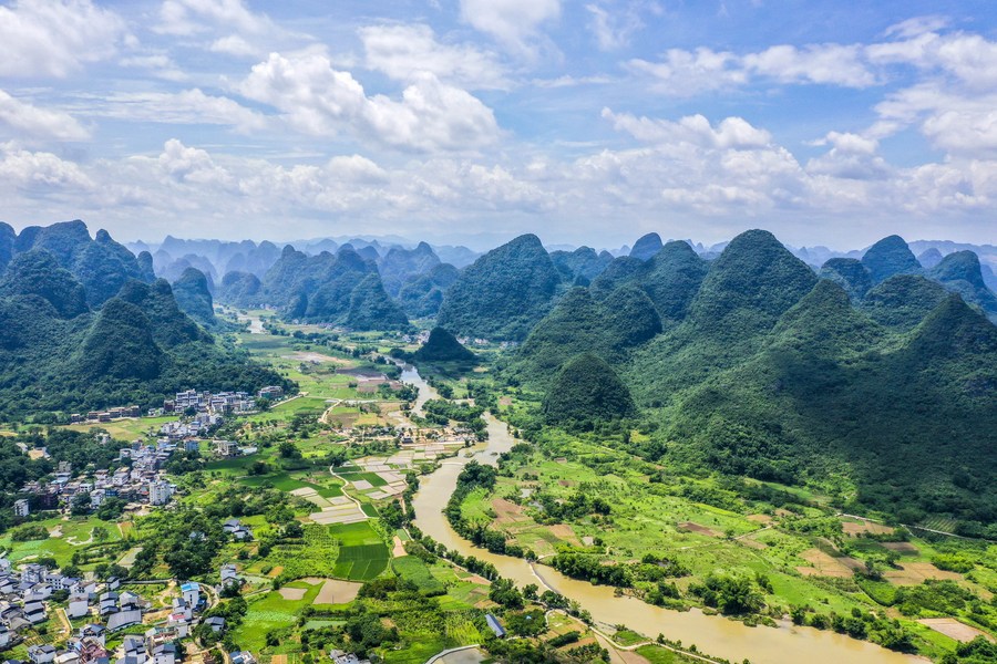 Aerial photo taken on July 4, 2020 shows a view of Yangshuo County in Guilin City, south China's Guangxi Zhuang Autonomous Region. (Xinhua/Cao Yiming)