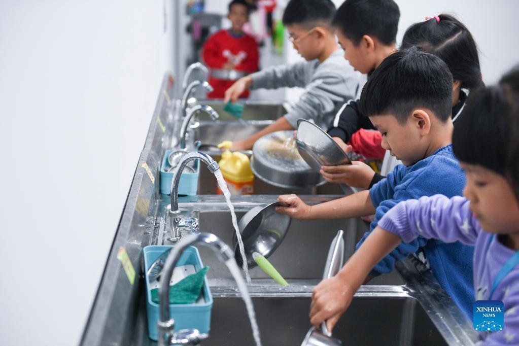 Pupils wash dishes during the cooking class at the Little Chef training center in Xishan Primary School in Shunde District of Foshan City, south China's Guangdong Province, Nov. 9, 2021. Xishan Primary School in Shunde has set up a Little Chef training center since September this year on its school campus in cooperation with Shunde Fengchu Vocational Skills Training School, providing students with a cooking class of 45 minutes after school every day. Professional cooking instructors, together with school teachers, give cooking lessons suitable for different ages at the training center. In the class, pupils can learn and practice the cooking of Chinese and Western cuisine, including making some easy-to-learn local Shunde specialties. Through the cooking course, pupils may learn about different food materials, understand how to prepare them, as well as build basic culinary skills and savor the dishes cooked by themselves. The course is open to students in all grades of school. There is one class provided each day and each class is attended by 60 students. The Little Chef cooking course has been well received by students and their parents since its launch. (Xinhua/Mao Siqian)