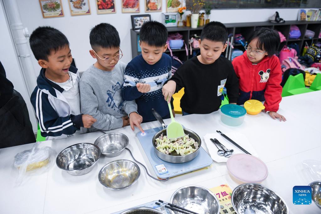Pupils learn to cook at the Little Chef training center in Xishan Primary School in Shunde District of Foshan City, south China's Guangdong Province, Nov. 9, 2021. Xishan Primary School in Shunde has set up a Little Chef training center since September this year on its school campus in cooperation with Shunde Fengchu Vocational Skills Training School, providing students with a cooking class of 45 minutes after school every day. Professional cooking instructors, together with school teachers, give cooking lessons suitable for different ages at the training center. In the class, pupils can learn and practice the cooking of Chinese and Western cuisine, including making some easy-to-learn local Shunde specialties. Through the cooking course, pupils may learn about different food materials, understand how to prepare them, as well as build basic culinary skills and savor the dishes cooked by themselves. The course is open to students in all grades of school. There is one class provided each day and each class is attended by 60 students. The Little Chef cooking course has been well received by students and their parents since its launch. (Xinhua/Mao Siqian)