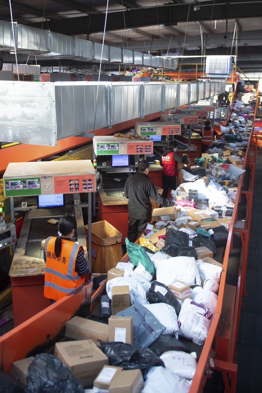 Staff members are busy sorting packages at a dispatch center of Yuantong Express Company in Jiangbei District, Ningbo of east China's Zhejiang Province, Nov. 10, 2021. (Xinhua/Jiang Han)