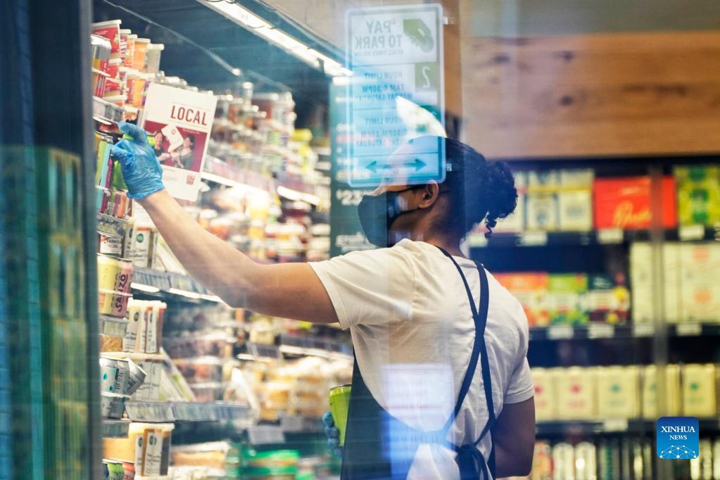 An employee works at a grocery store in Washington, D.C., the United States, on Nov. 10, 2021. U.S. inflation remained elevated in October as supply chain disruptions have persisted for months, surging to the highest level in three decades, the Labor Department reported on Wednesday. The consumer price index (CPI) soared 0.9 percent in October after rising 0.4 percent in September, according to the latest report released by the department's Bureau of Labor Statistics. (Photo by Ting Shen/Xinhua)