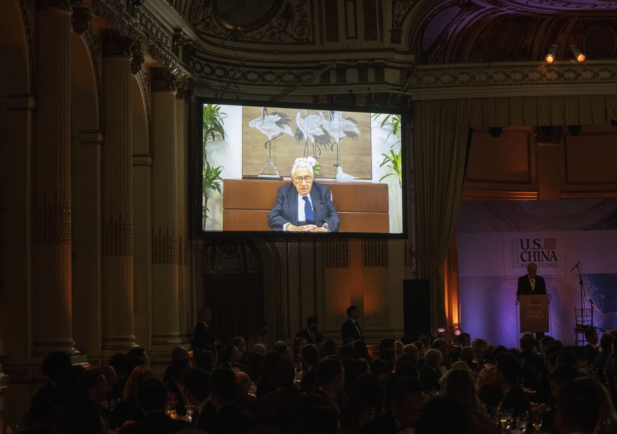 Former U.S. Secretary of State Henry Kissinger (on screen) delivers a video speech during the 2021 Gala Dinner of the National Committee on U.S.-China Relations in New York, the United States, Nov. 9, 2021. (Xinhua/Wang Ying)