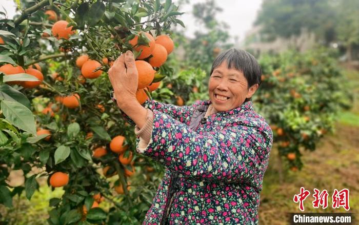 A farmer picks oranges at her fruit orchard in Danleng county, southwest China’s Sichuan province. (Chinanews.com/Cheng Huanyue)