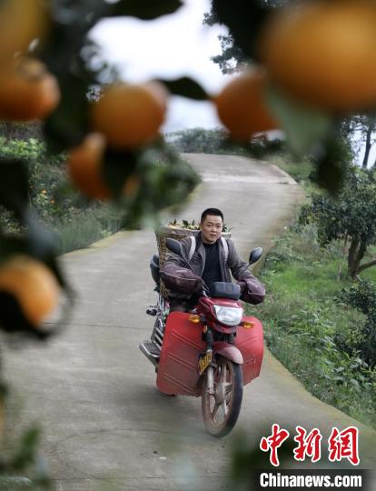 A fruit picker carries a basket of oranges on his back while riding a motorcycle. (Chinanews.com/Wu Zhiqiang)