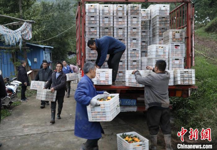 Fruit pickers load oranges onto a truck. (Chinanews.com/Wu Zhiqiang)