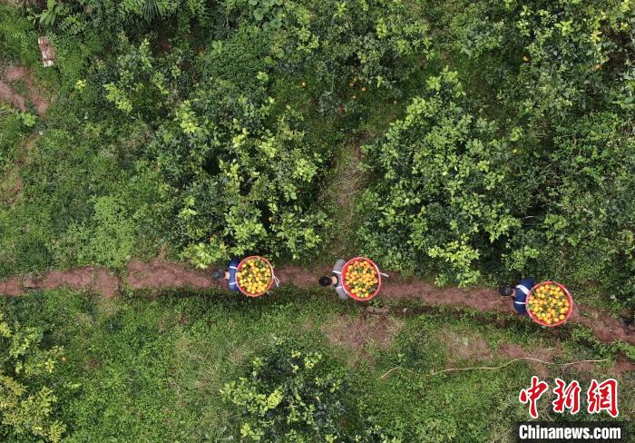 Aerial photo shows three fruit pickers walking through an orchard, each carrying a basket of oranges on his back. (Chinanews.com/Wu Zhiqiang)