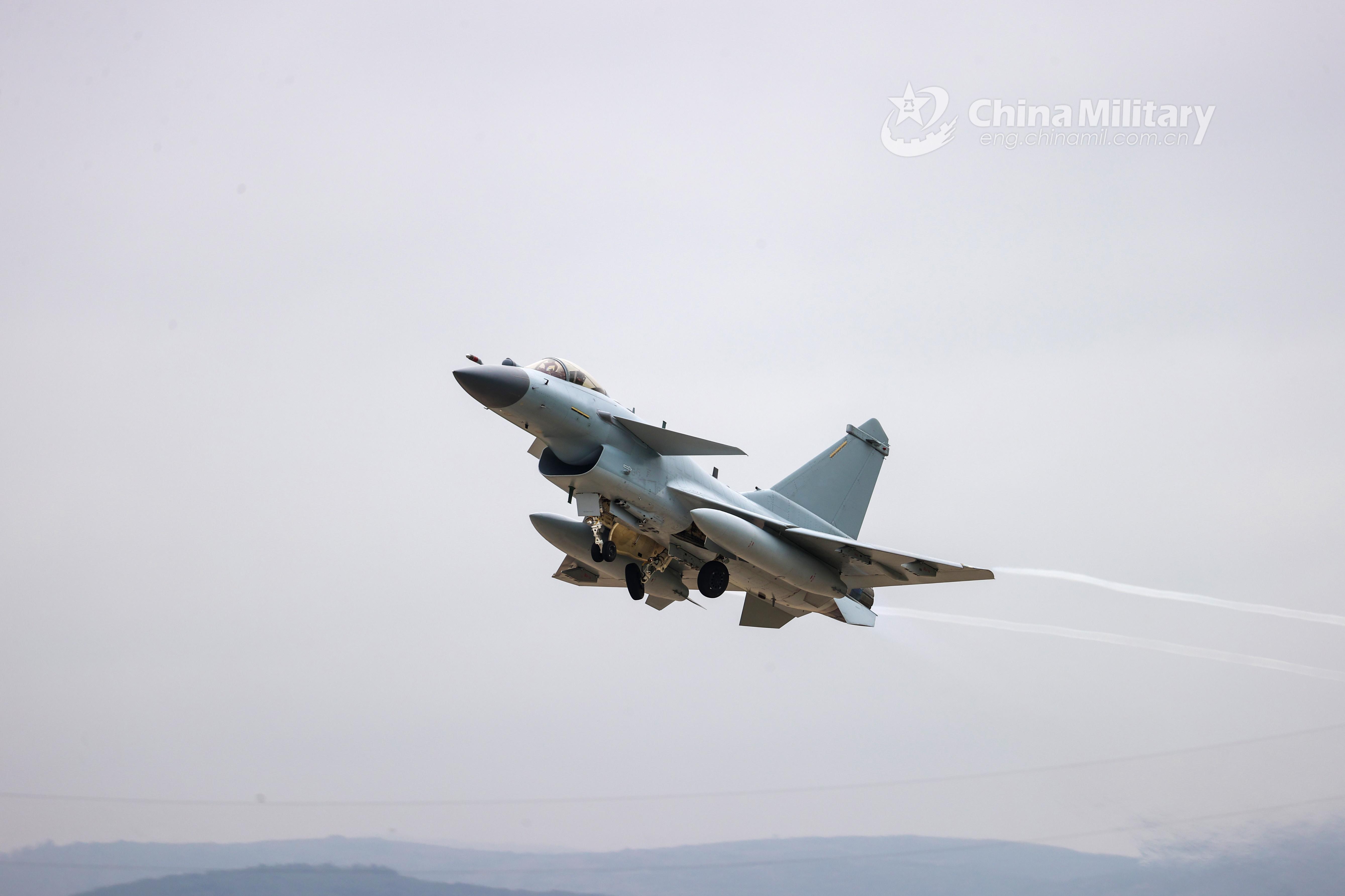 A J-10 fighter jet attached to an aviation brigade of the air force under the PLA Southern Theater Command takes off during a flight training exercise on October 11, 2021. (eng.chinamil.com.cn/Photo by Wang Guoyun)