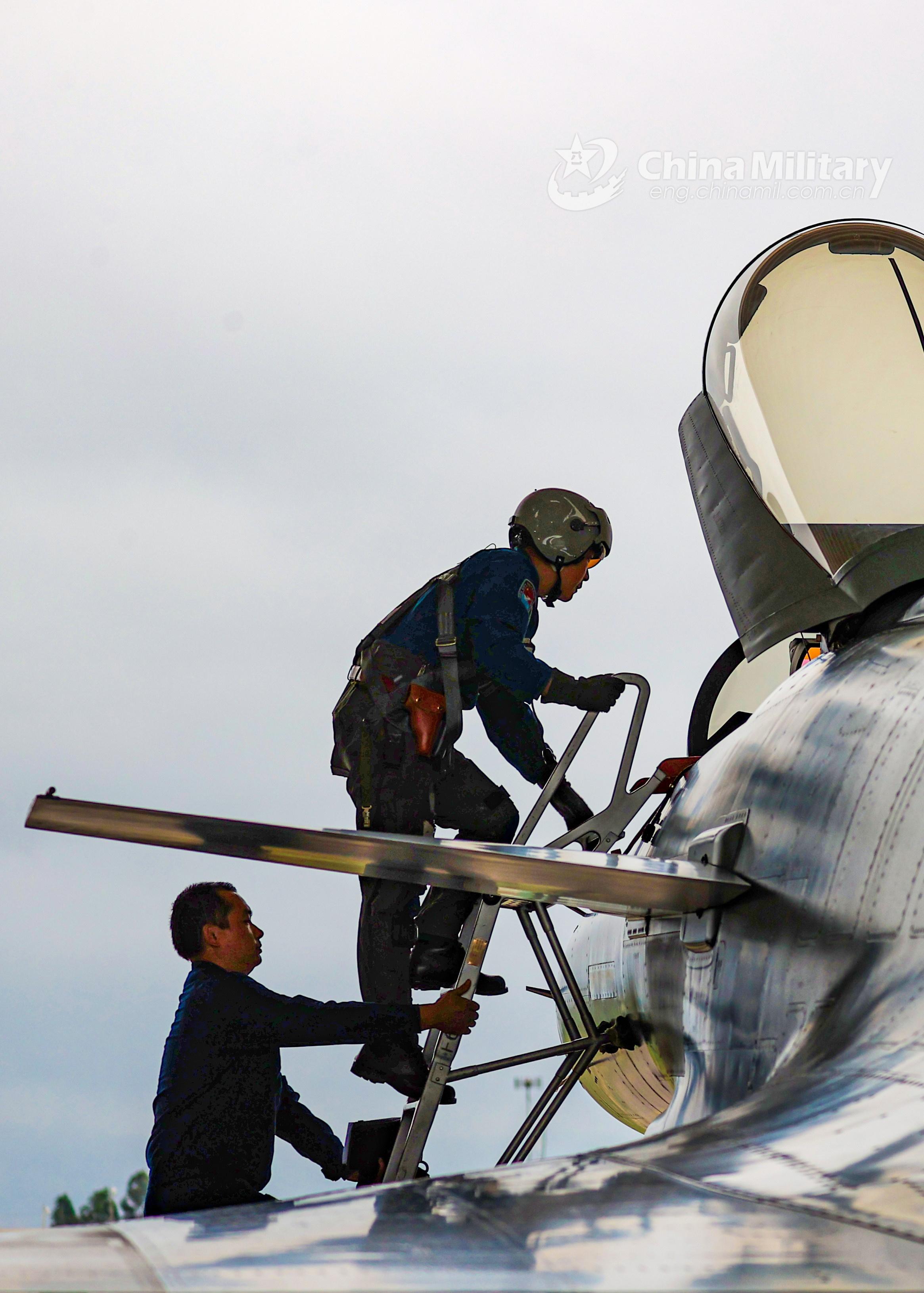 A pilot assigned to an aviation brigade of the air force under the PLA Southern Theater Command climbs into the cockpit of his J-10 fighter jet during a flight training exercise on October 11, 2021. (eng.chinamil.com.cn/Photo by Wang Guoyun)