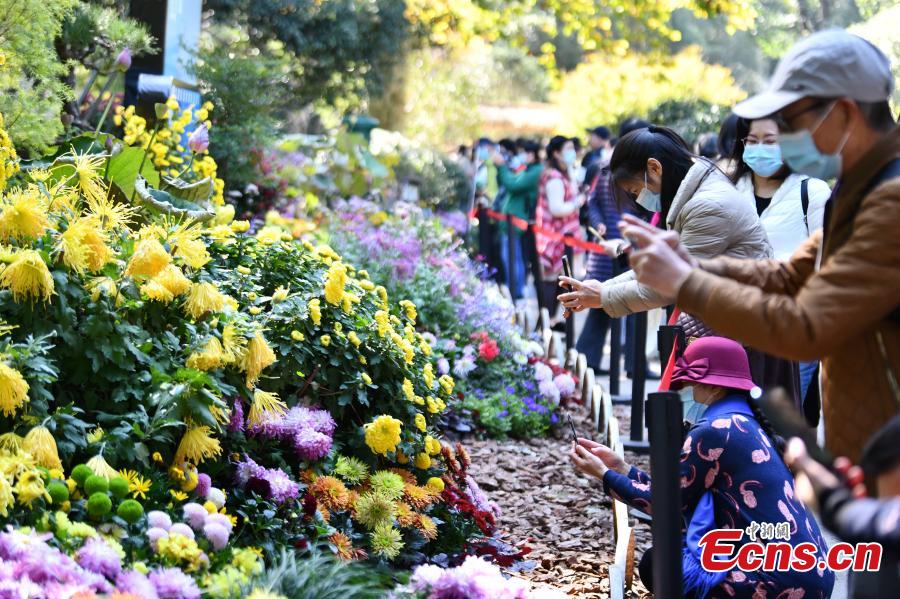 People take photos of colorful chrysanthemums at the second Yangtze River Delta Chrysanthemum Show in Hangzhou Botanical Garden, Zhejiang Province, Nov. 10, 2021. (Photo/Zhang Yin)