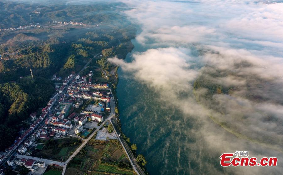 Magnificent clouds and mist appears in Xiu River reach of Qingjiang Township, Jiujiang City, Jiangxi Province, Nov. 9, 2021. (Photo/Jiang Dexian)