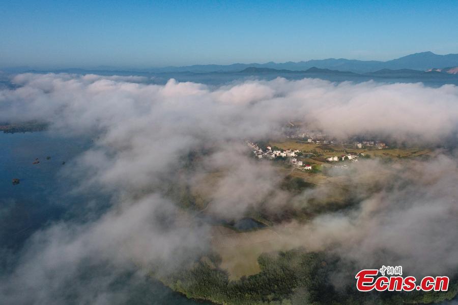 Magnificent clouds and mist appears in Xiu River reach of Qingjiang Township, Jiujiang City, Jiangxi Province, Nov. 9, 2021. (Photo/Jiang Dexian)