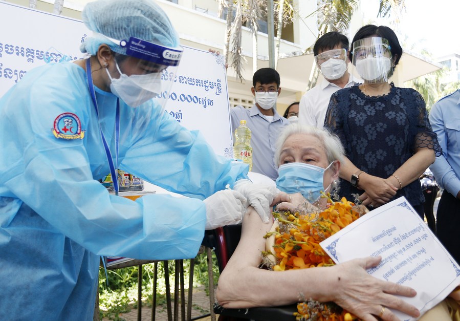 Ho Kham, a 101-year-old Cambodian woman, receives her second dose of Sinovac COVID-19 vaccine at an inoculation site in Phnom Penh, Cambodia on July 2, 2021. (Photo by Phearum/Xinhua)