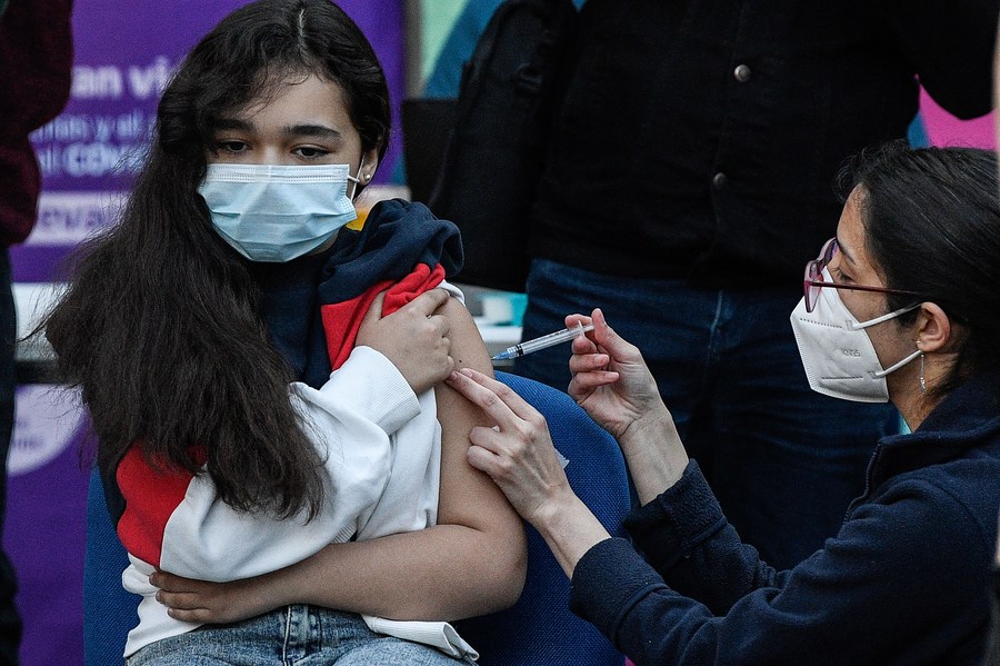 A child receives a dose of Sinovac COVID-19 vaccine in Santiago, Chile, Sept. 27, 2021. (Photo by Jorge Villegas/Xinhua)