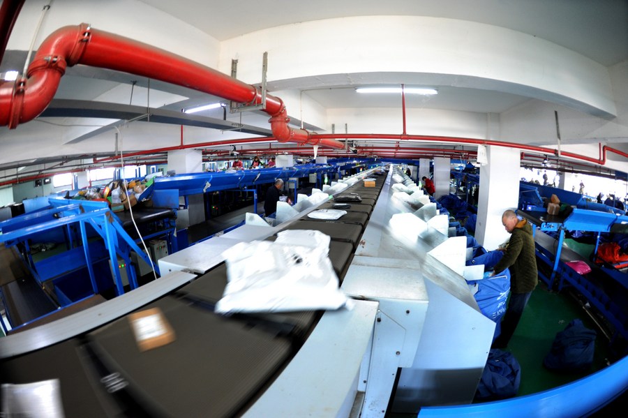 Workers sort out packages at an industrial park in Lianyungang, east China's Jiangsu Province, Nov. 11, 2021. The Singles' Day shopping spree is an annual online shopping festival falling on Nov. 11 for Chinese consumers since 2009. (Xinhua/Wang Chun)