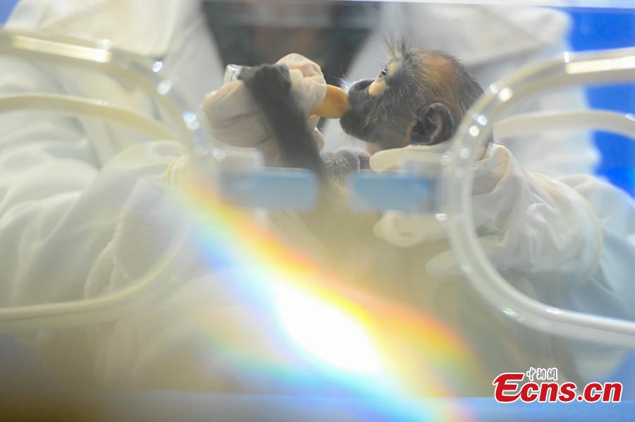 The black-shanked douc langur drinks milk in incubators at Chimelong Safari Park in Guangzhou, Guangdong Province, Nov. 10, 2021. (Photo: China News Service/Chen Jimin)