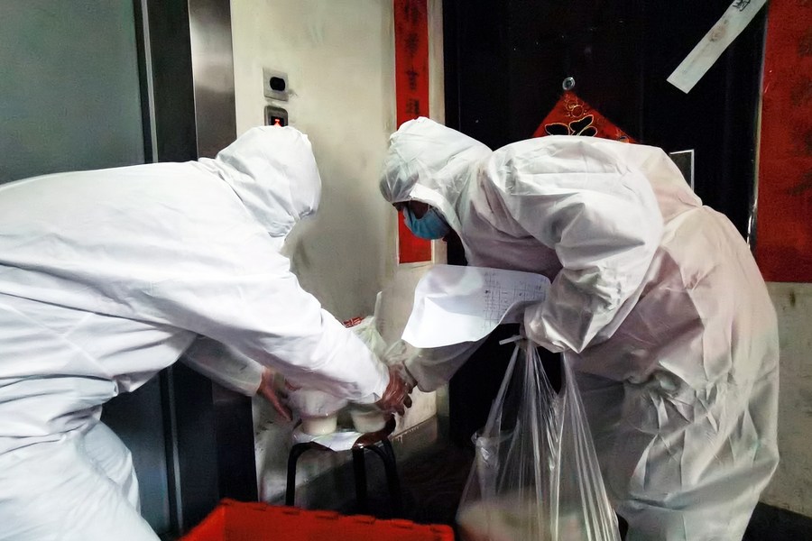 Staff members distribute free meals for residents at a residential area under temporary lockdown due to resurgence of COVID-19 in Chengguan District of Lanzhou, northwest China's Gansu Province, Oct. 26, 2021. (Photo by Xing Yanan/Xinhua)