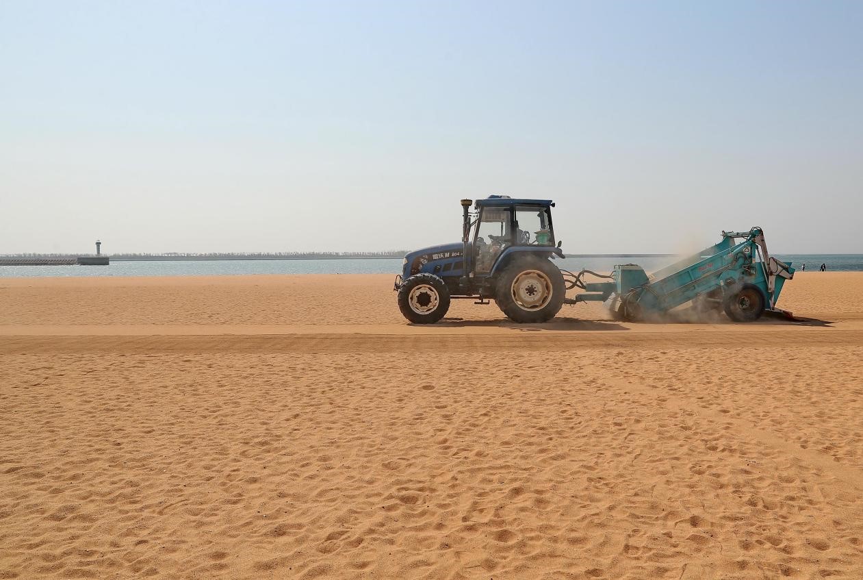 Photo taken on April 19, 2021 shows a worker cleaning the beach with machinery at a bathing beach in Haigang district, Qinhuangdao city, north China’s Hebei province. (People’s Daily Online/Cao Jianxiong)