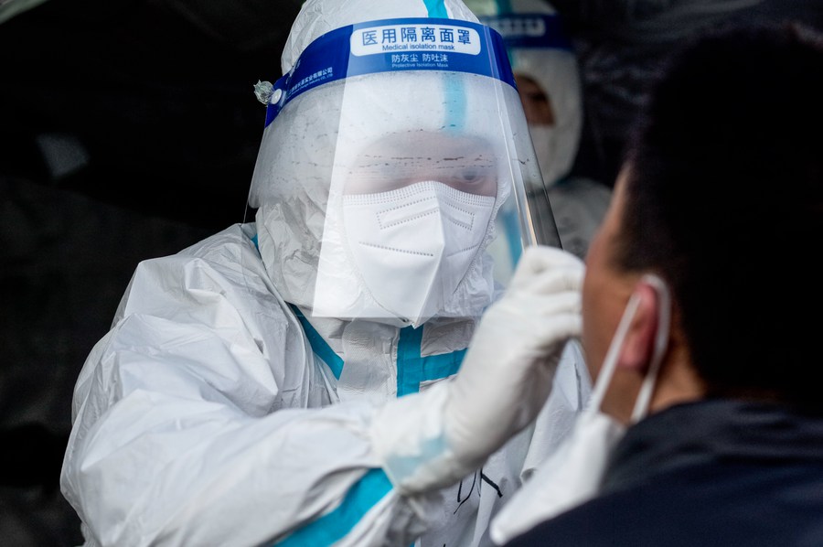 A medical worker takes a swab sample from a citizen for nucleic acid test at a testing site in Xining, northwest China's Qinghai Province, Nov. 8, 2021. (Xinhua/Wu Gang)