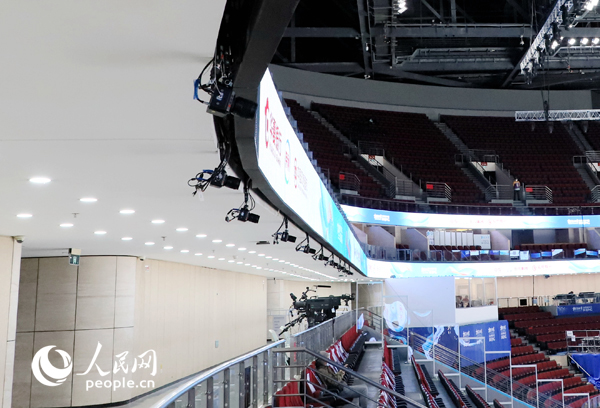 Photo shows cameras installed around the competition venue in the Wukesong Ice Sports Center in Beijing. (People’s Daily Online/Hu Xuerong)