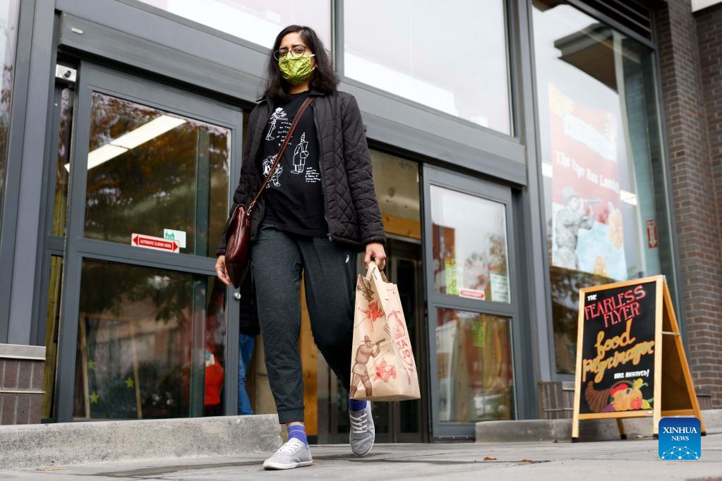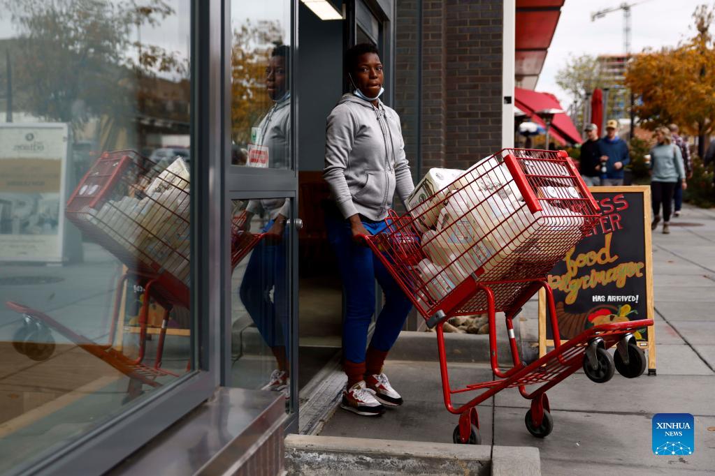 A customer walks out of a supermarket with a bag of groceries in Washington, D.C., the United States, on Nov. 12, 2021. The U.S. Federal Reserve will be forced to start raising interest rates in 2022 as inflation pressures will remain elevated over the next two years, according to a report released by the Economics Group of Wells Fargo Securities on Friday. (Photo by Ting Shen/Xinhua)