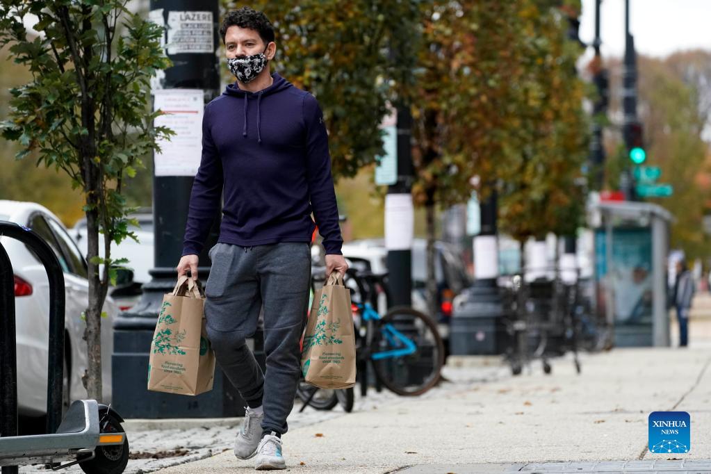 A man walks on a street after shopping groceries at a supermarket in Washington, D.C., the United States, on Nov. 12, 2021. The U.S. Federal Reserve will be forced to start raising interest rates in 2022 as inflation pressures will remain elevated over the next two years, according to a report released by the Economics Group of Wells Fargo Securities on Friday. (Photo by Ting Shen/Xinhua)